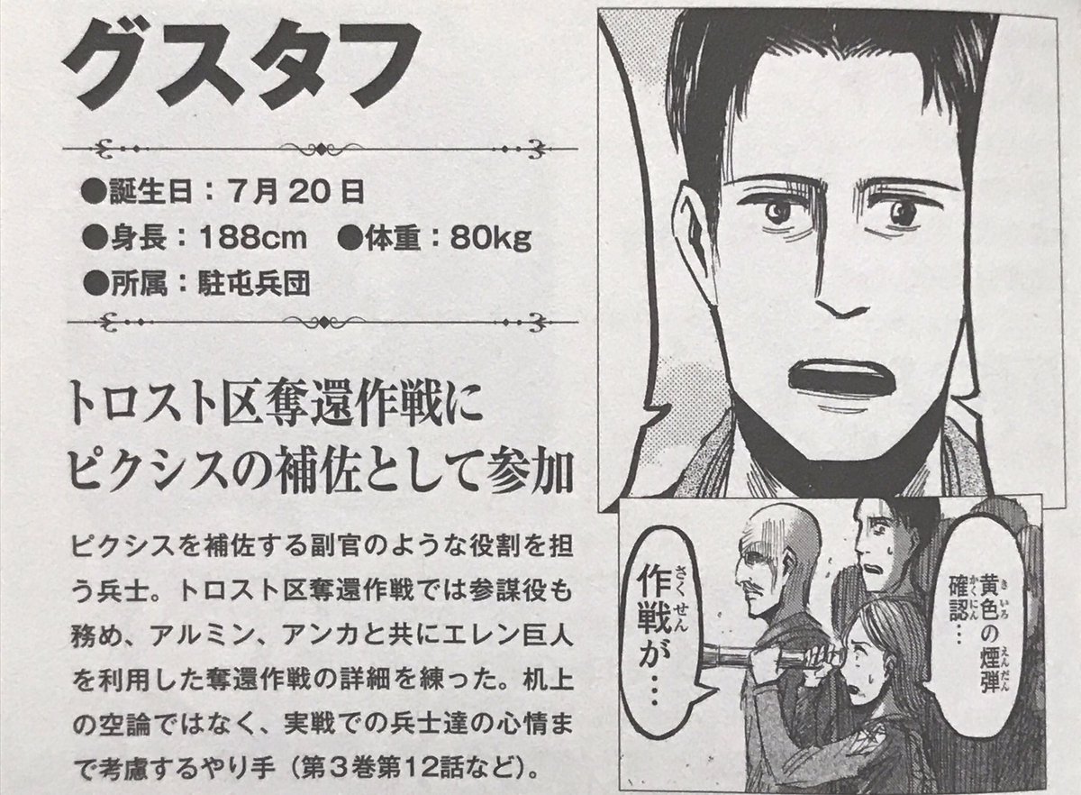 ルル V Twitter 進撃の巨人 グスタフの誕生日 おめでとう ๑ ノノ゙ パチパチ 進撃好きはいいね Rtで祝いましょう まだ生きてるのかな ピクシス司令が巨人化しちゃったから近くにいたと思うし きっともう 進撃の巨人 進撃の巨人好きな人と繋がり